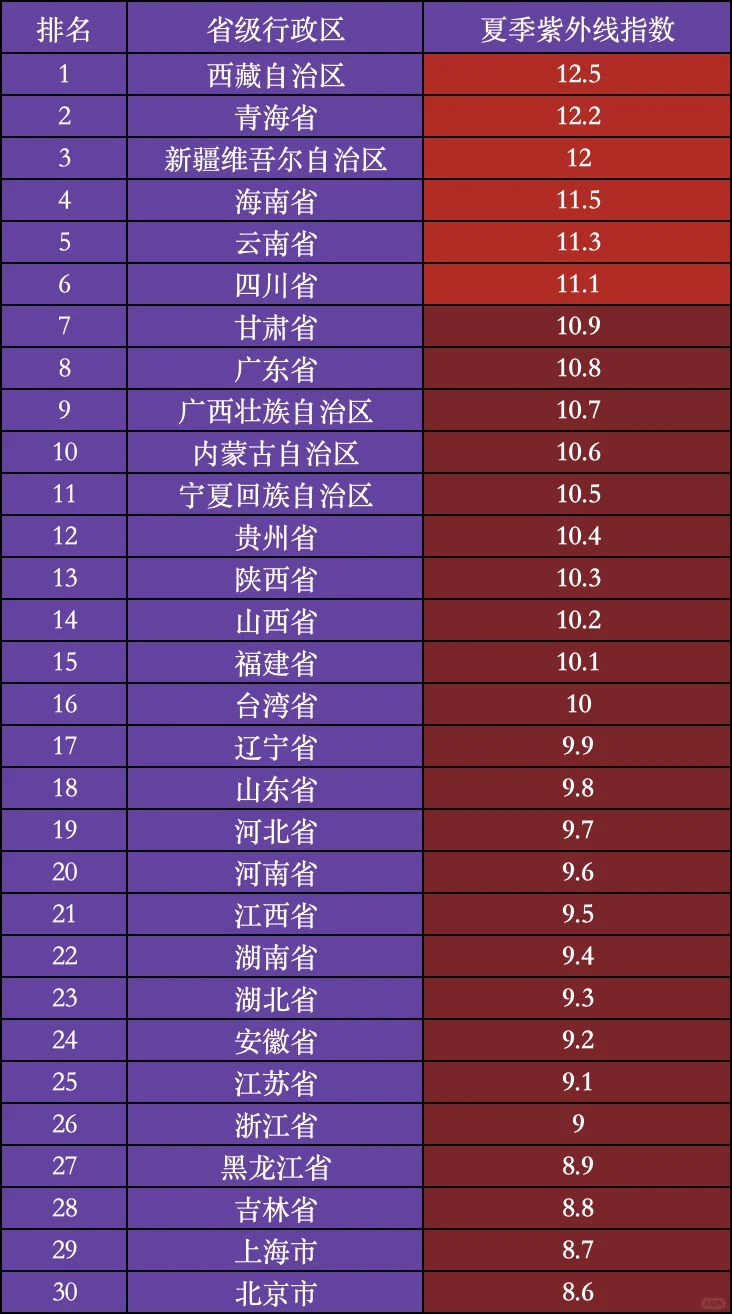 海拔是影响紫外线强度的关键因素,高海拔地区几乎都是紫外线高危区: