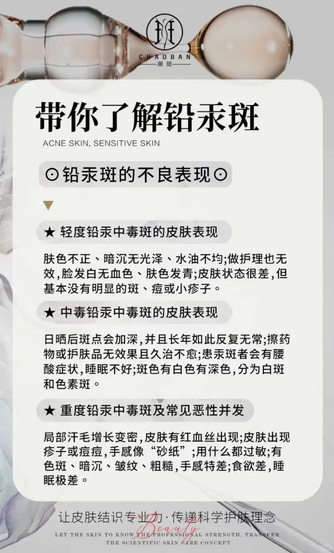 (2)铅汞斑:重金属中毒的 “深层色素异常”,不可逆且伤屏障