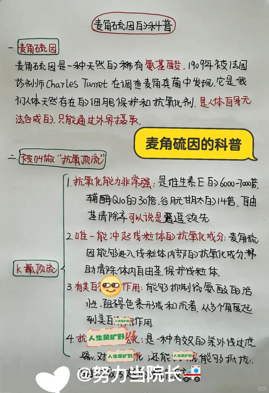 - 化学特性:麦角硫因是一种天然含硫氨基酸衍生物,主要存在于蘑菇、谷物等食物中,水溶性且稳定性高,能被人体细胞主动吸收并积累,尤其在红细胞、肝脏、皮肤等组织中浓度较高。