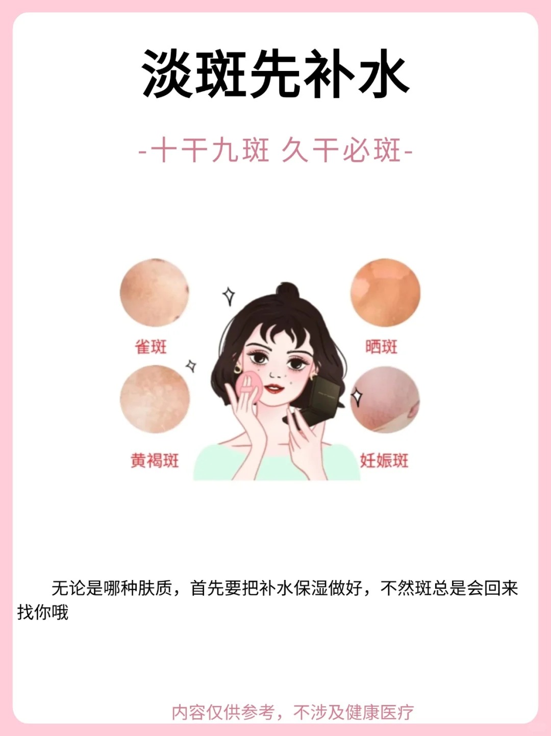 - 补水重建屏障:充足的水分能让角质层细胞饱满水润,促进皮脂膜分泌,增强皮肤的防御能力。屏障健康的皮肤能更好地耐受淡斑成分,减少炎症和反黑风险,就像给皮肤穿上 “防护衣”,让淡斑过程更安全。