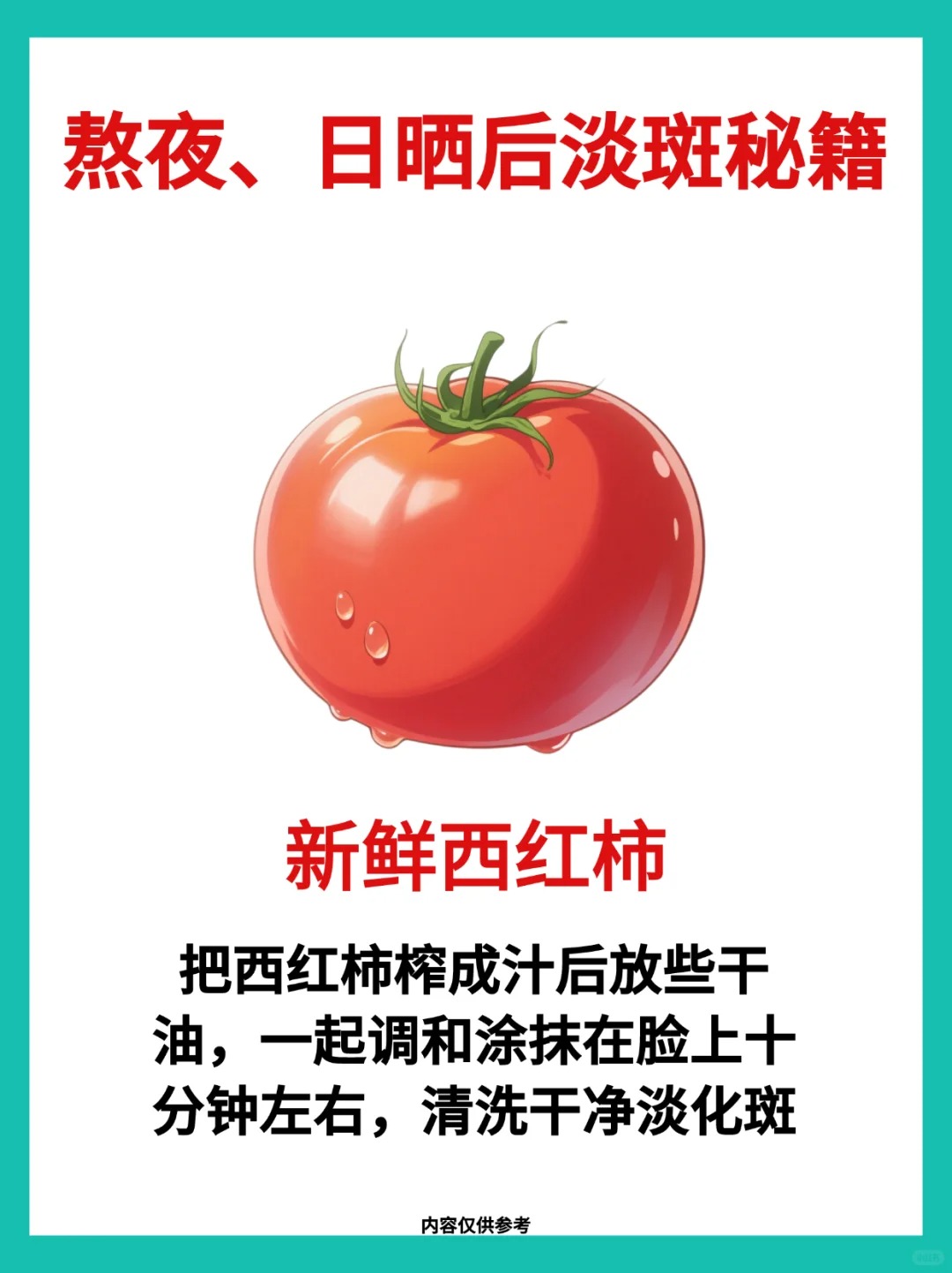 西红柿作为常见的蔬菜,不仅营养丰富,还被很多人当作 “天然美白食材”,民间常有 “吃西红柿淡斑” 的说法。这让不少人好奇:“西红柿为什么可以淡斑?这种日常食材真的有这么神奇的效果吗?” 西红柿的淡斑效果并非夸张,而是其独特的营养成分和对皮肤的多重作用共同实现的。真相是西红柿通过富含的维生素 C、番茄红素等抗氧化成分抑制黑色素生成,同时促进皮肤代谢、修护屏障,从内到外辅助色斑淡化,尤其对晒斑、肤色暗沉等问题效果明显。了解西红柿的淡斑成分、作用机制、食用与外用方法,能帮你科学利用这一平价食材,实现安全温和的淡斑效果。今天就从成分解析、淡斑机制、使用指南和注意事项四个维度,讲清这一问题。