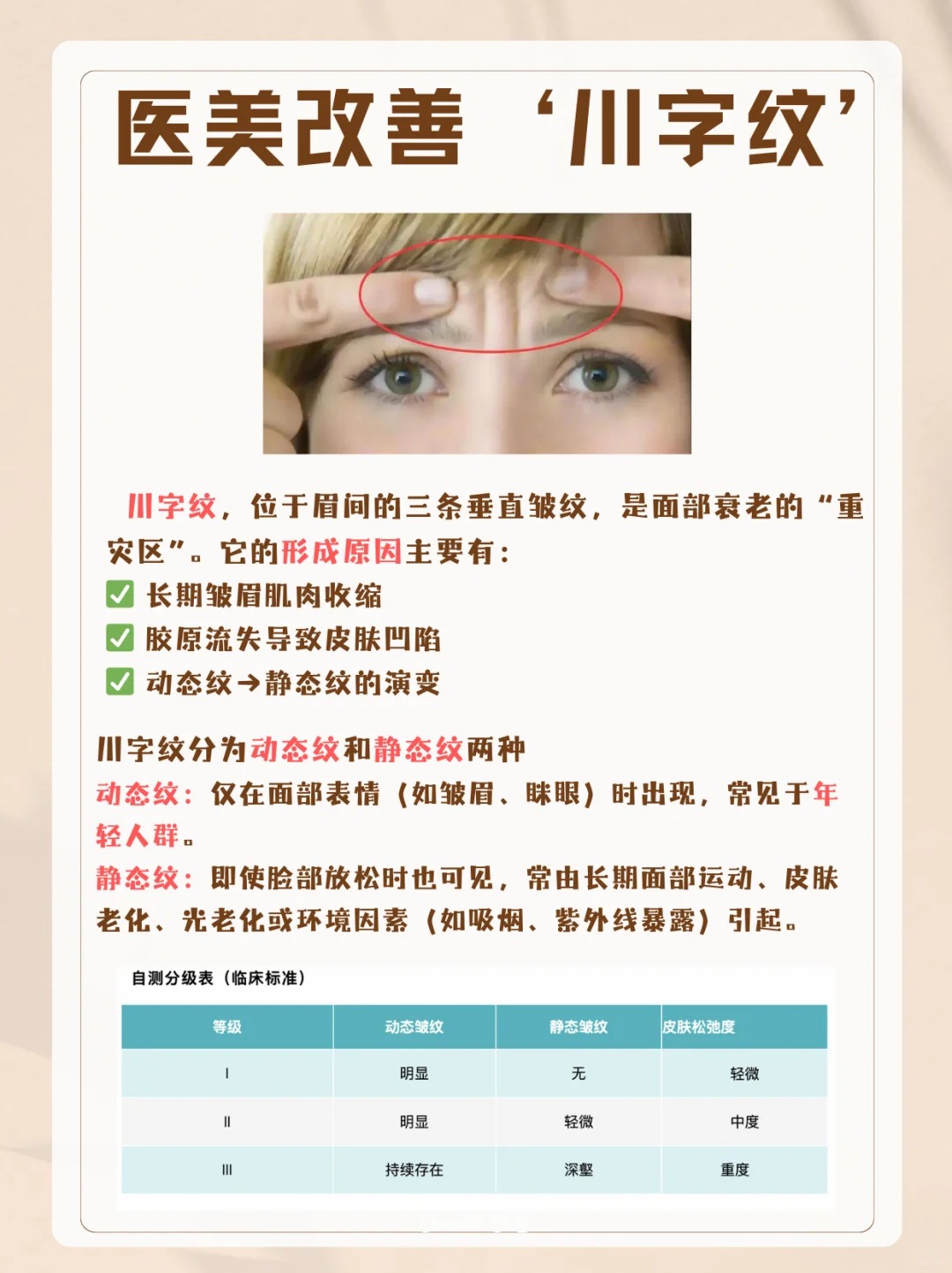 细纹(不笑也能看到)是胶原流失导致的 “真性纹”,动态纹(笑时明显)是表情肌收缩导致的,这两类皱纹需要 “补胶原” 或 “放松肌肉”,而玻尿酸没有这些作用: