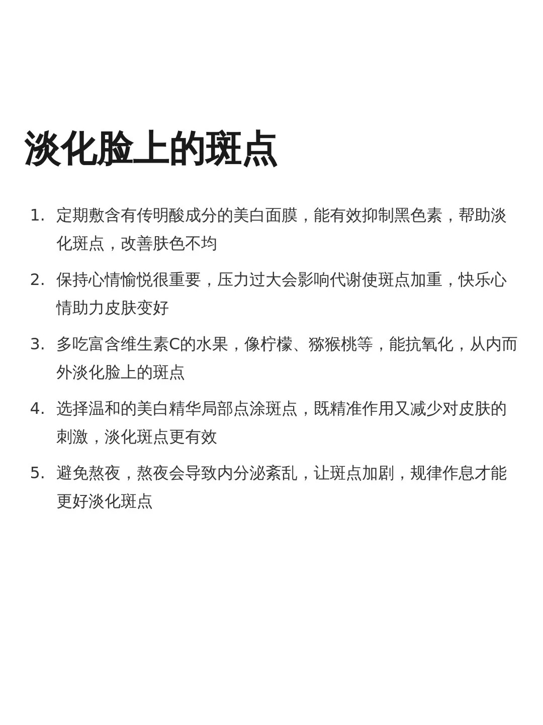 - 正确:把面膜当作 “淡斑辅助”,搭配淡斑精华(作用更深层)、严格防晒(防止新色斑生成),才能真正改善色斑。