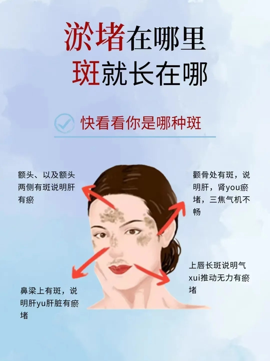 - 斑点特点:多为轻度黄褐斑(点状或片状)或暗沉型色斑,颜色多为淡褐色或灰褐色,斑点会随激素波动、压力变化而加深,且伴随左边额头皮肤暗沉、出油增多,甚至出现细小痘痘。