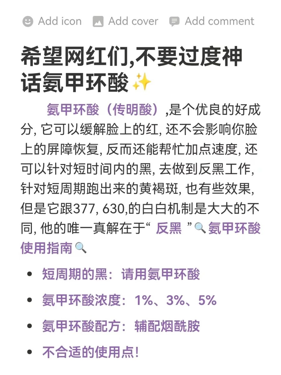 虽然氨甲环酸本身温和,但部分人(尤其是敏感肌、屏障受损肌)用高浓度氨甲环酸膏(如 5% 以上)时,仍可能出现轻微刺激感(如泛红、刺痛):