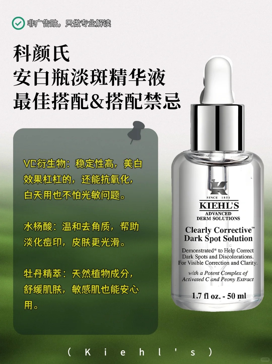 - 科颜氏淡斑精华的优势与局限:优势是靠维 C 衍生物抑制黑素生成,改善晒斑、痘印、肤色不均,提亮效果明确;局限是保湿力仅够基础需求(含少量透明质酸),无抗老功效,秋冬干燥时单用可能让皮肤紧绷,初老肌用后仍会有干纹;