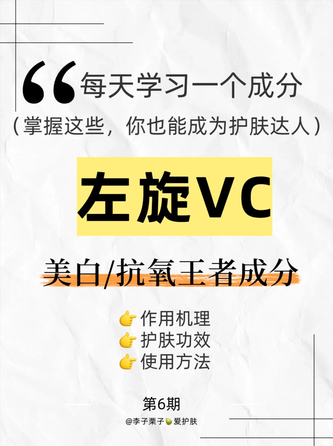 - 左旋 VC(原型 VC):像 “黑素工厂的‘停工令’”—— 酸性环境下(pH3.0 左右)能抑制酪氨酸酶活性,直接减少黑素生成,还能还原已形成的浅层色素(比如刚长的晒斑),提亮速度快,2-3 周就能看到肤色透白;