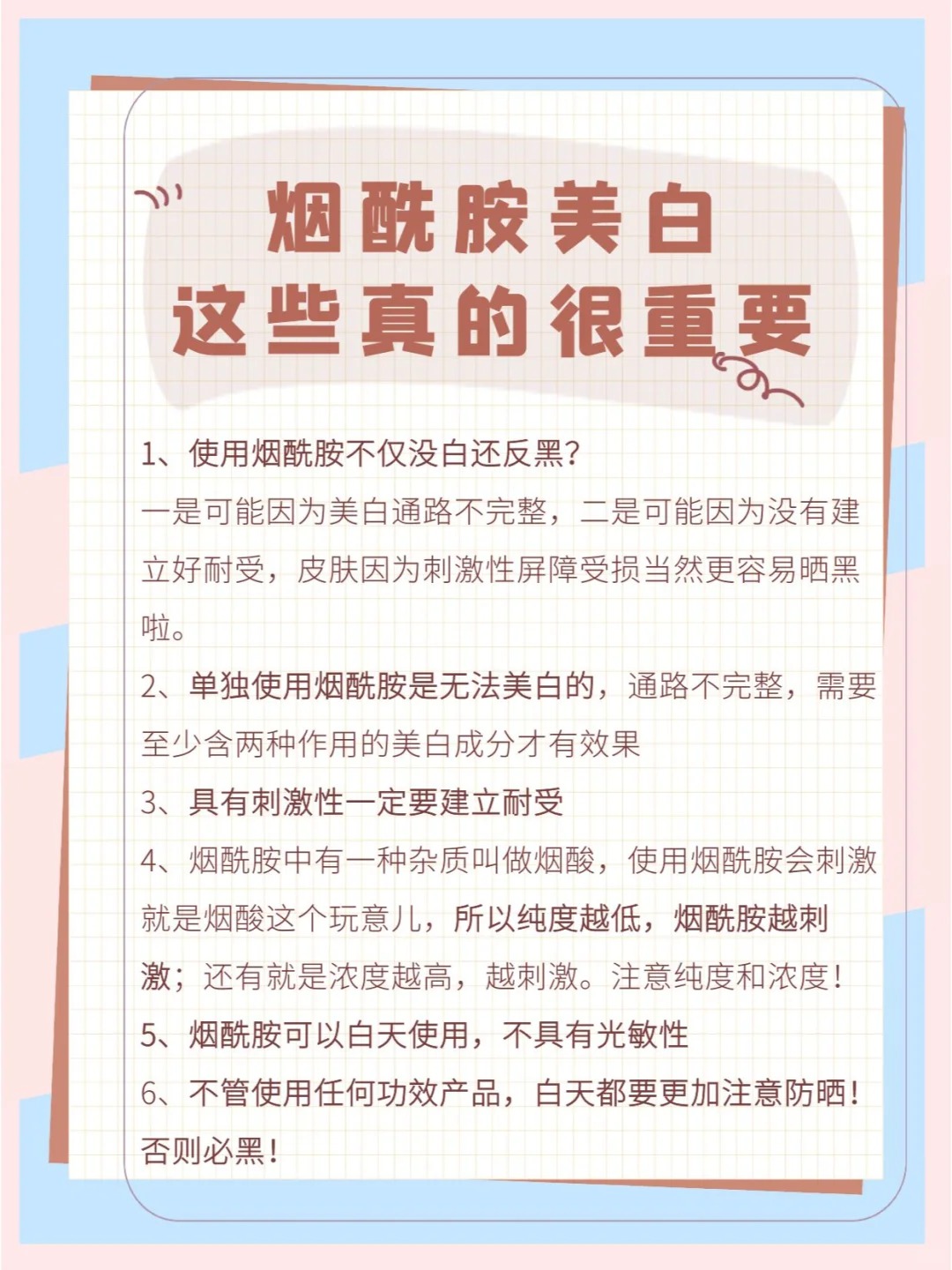 理由:烟酰胺白天用稳定,不感光,还能控油、抗污染,减少紫外线导致的自由基损伤,避免新色斑生成;搭配防晒,为皮肤 “筑起双重防线”;