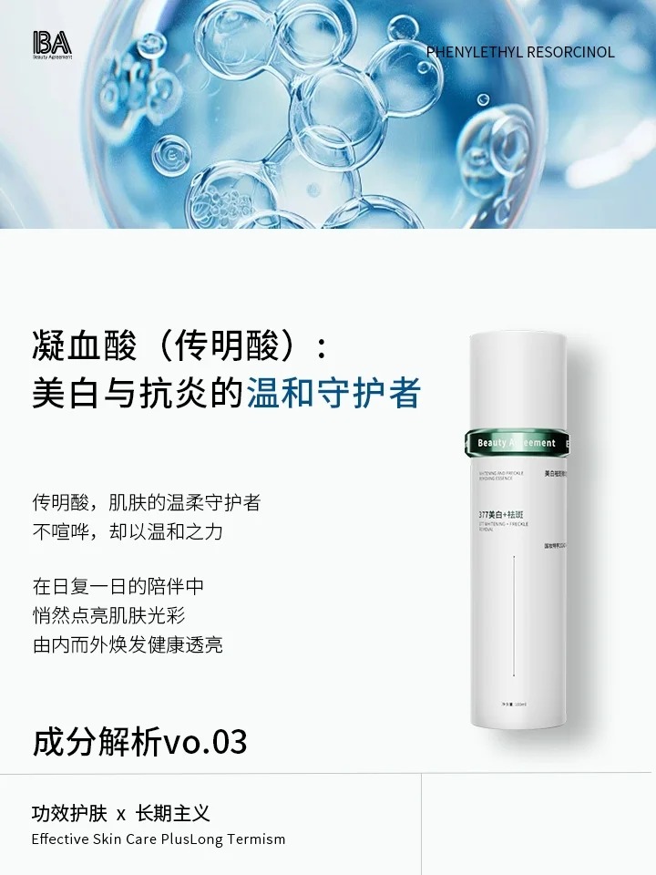 - 效果体现:敏感肌用含 3% 凝血酸的精华,2-3 周后:换季泛红次数减少,用温和的 VC 精华也不刺痛;痘肌用后,红色痘印消退速度加快,很少再变成难淡的褐色痘印。