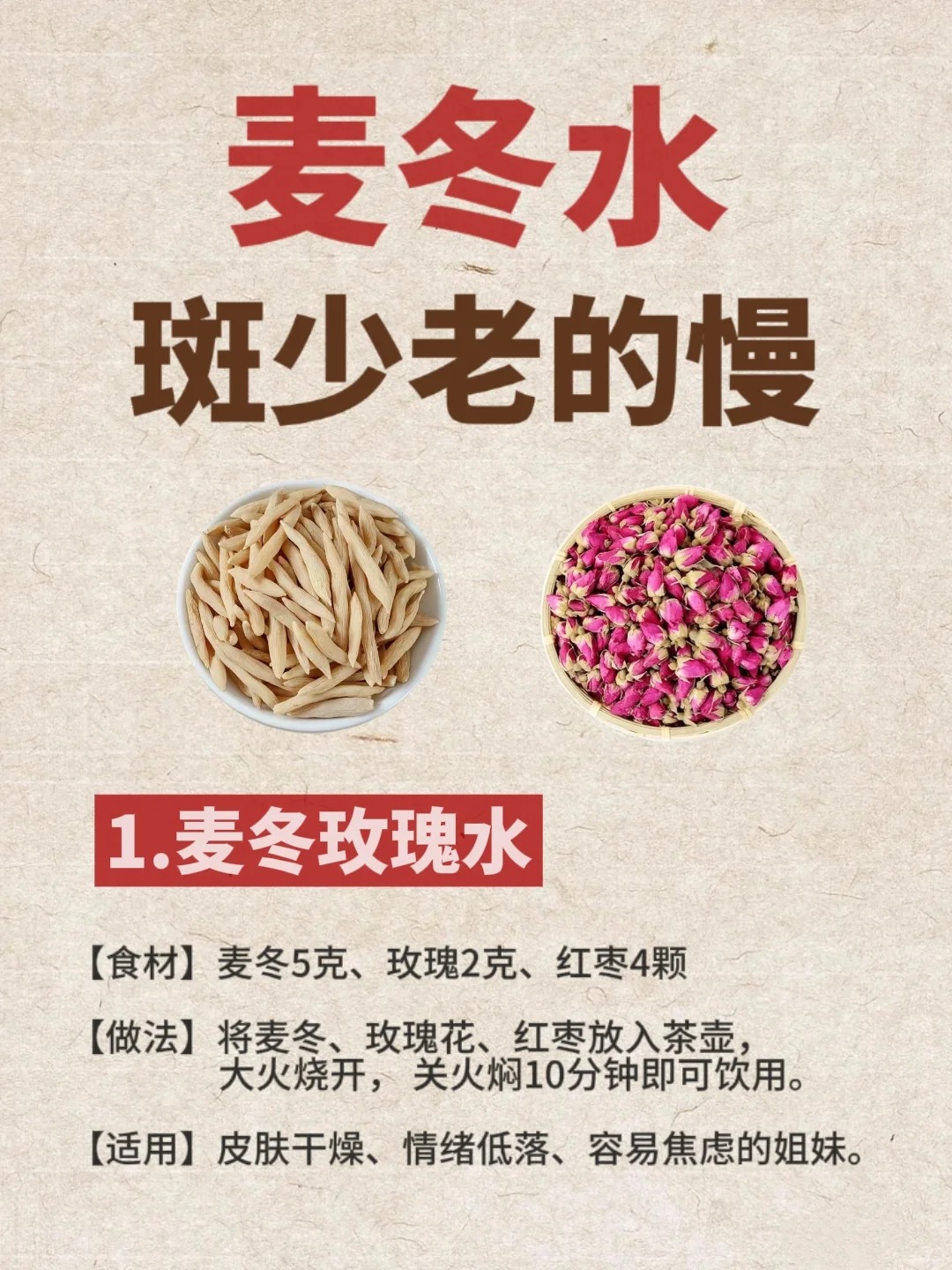 正确做法:激素型黄褐斑需 “调激素 + 疏肝”(如氨甲环酸、玫瑰花茶),绝对别用麦冬。