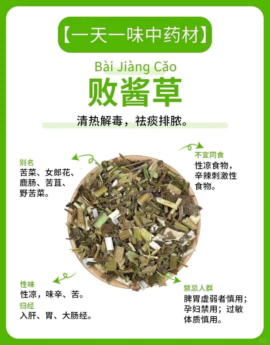无论是常见的 “败酱草”(如菊科败酱属植物,分黄花、白花品种,核心功效一致),其药用价值都围绕 “清湿热、祛瘀血、排脓毒”,和皮肤黑素毫无关联: