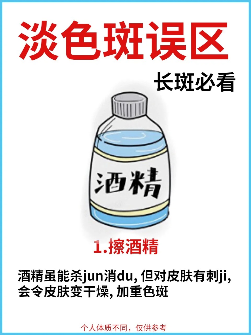 - 关键提醒:酒精没有任何 “抑制黑素生成”“代谢黑素” 的成分,就算用最高浓度的酒精擦脸,也不会让晒斑、雀斑的颜色变浅,更不会让斑的面积缩小。