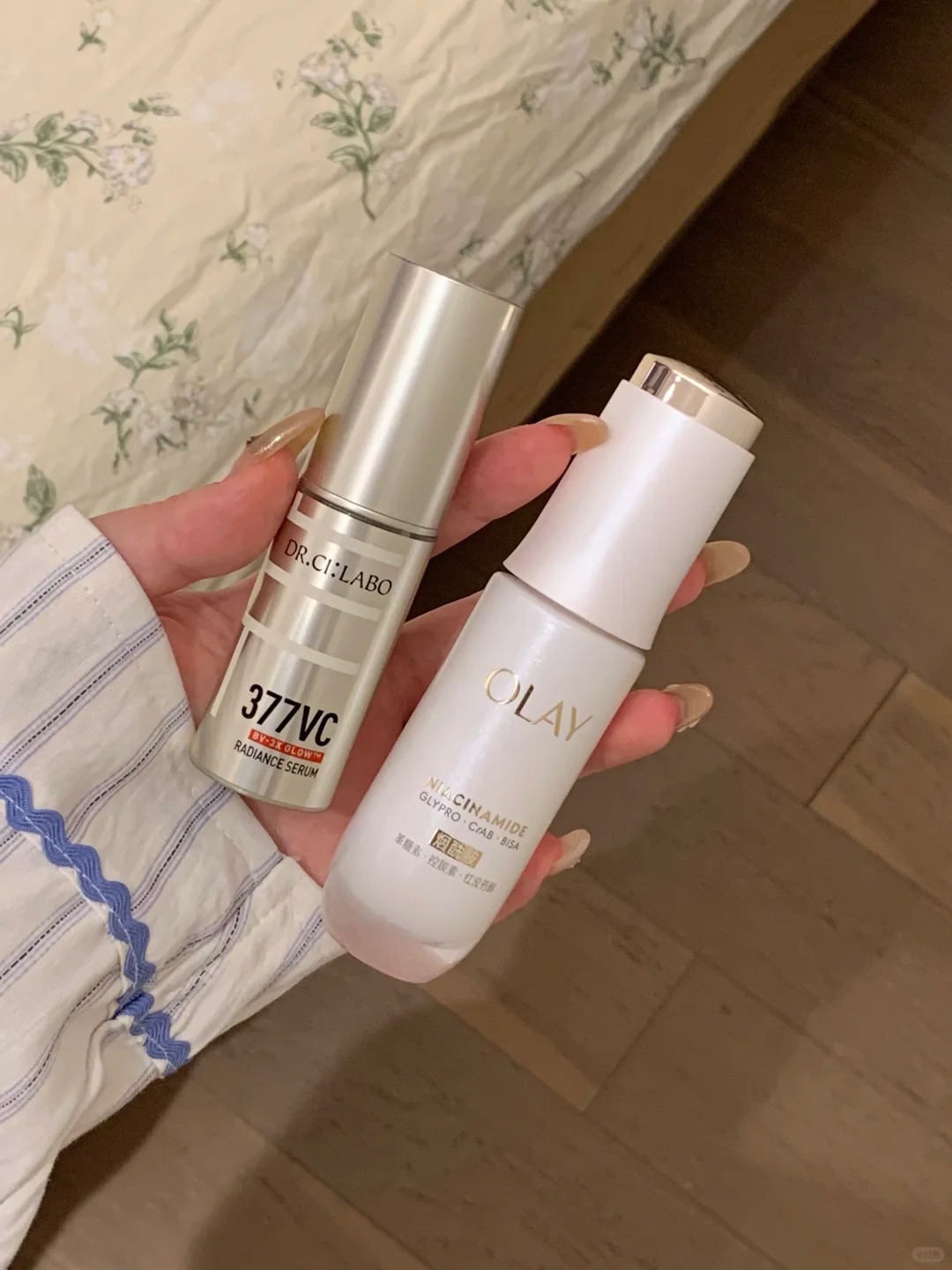 早上用 OLAY 烟酰胺(控油 + 全脸提亮,适合白天后续涂防晒、化妆),晚上用清爽型 377(重点涂晒斑,晚上皮肤代谢快,淡斑效果更好);
