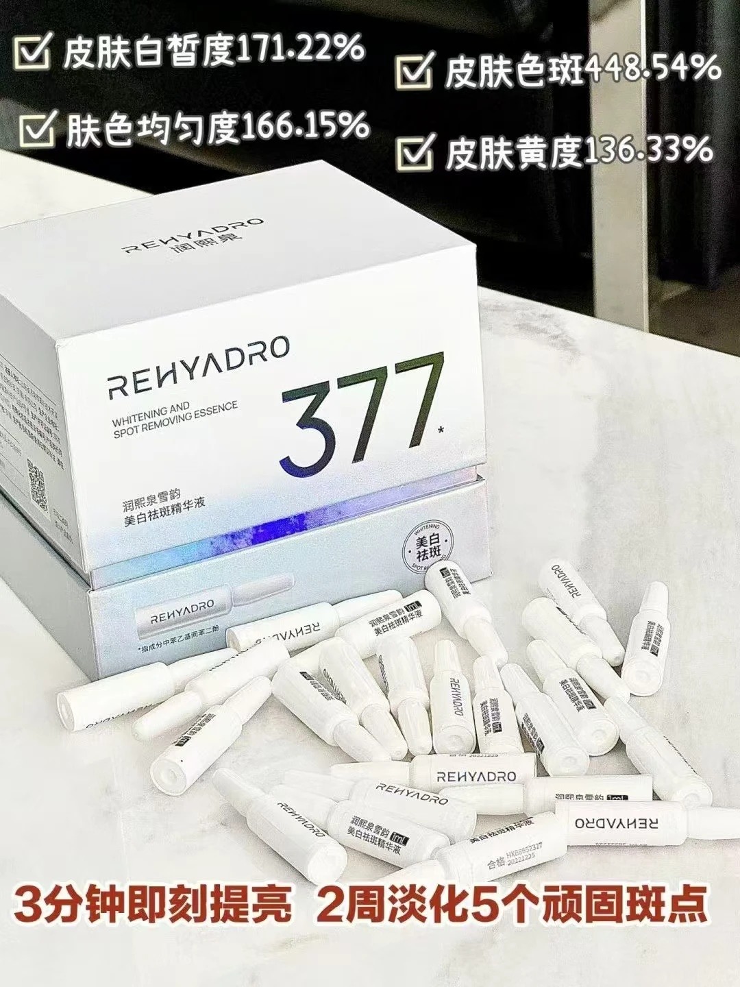 对于晒斑、炎症后色沉(比如红痘印转黑)这类 “浅层斑小怪兽”,它们就像是一些小喽啰,相对比较容易对付,润熙泉 377 打斑弹的效果也来得更快。通常在使用 14 天左右,就能看到明显的淡化效果,就像一阵风吹过,把这些小瑕疵轻轻带走 。如果能在配合医美项目(如光子嫩肤)后使用 377 打斑弹,效果会更加显著。光子嫩肤就像是一位强大的 “魔法师”,它可以击碎皮肤中的黑色素,而 377 打斑弹则能加速代谢这些被击碎的黑色素,两者强强联手,不仅能让淡化速度提升 30%,还能有效降低 50% 的反黑率,让肌肤更快地恢复白皙 。