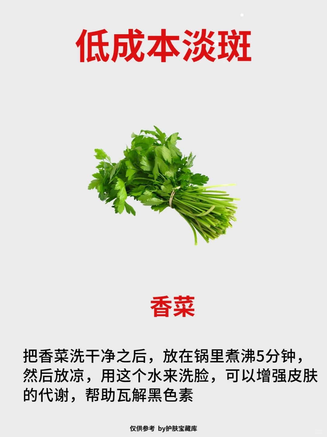 香菜的成分构成决定了其不具备有效的淡斑能力,所谓 “淡斑成分” 的含量和活性都无法达到改善雀斑的标准。